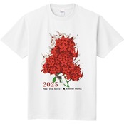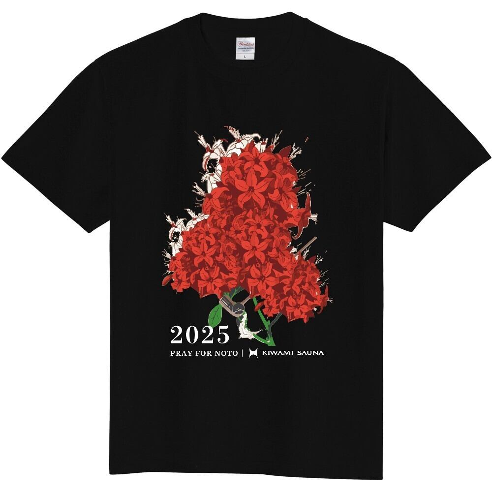 本チャリティーTシャツには、「サウナから能登の復興を応援したい」という想いを込め、能登の風土を象徴する「のとキリシマツツジ」に、KIWAMI SAUNAのロウリュラドルで水やりをするデザインをあしらいました。