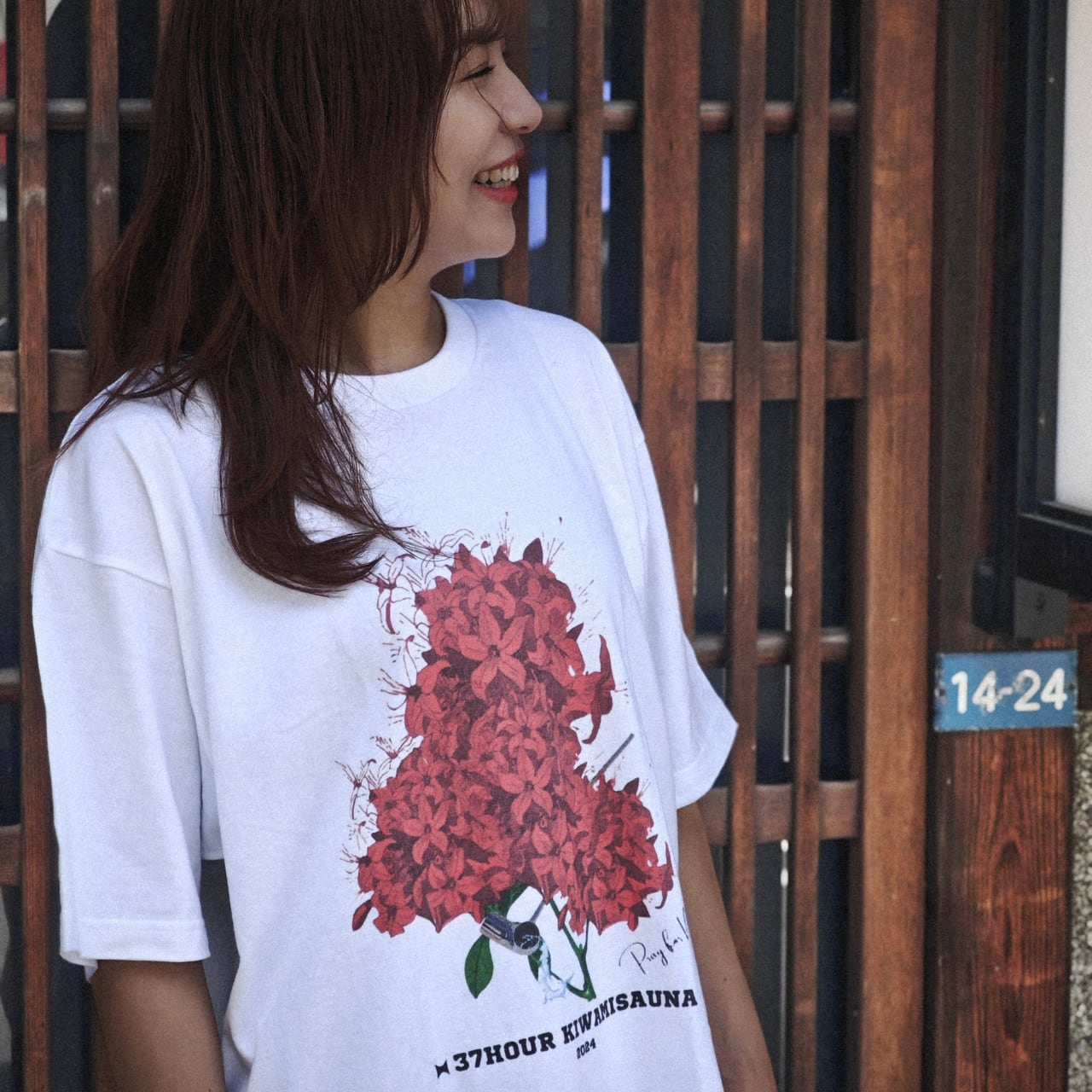 チャリティーTシャツには、サウナから能登の復興を応援する想いを込め、能登の風土の象徴とされる「のとキリシマツツジ」にKIWAMI SAUNAのロウリュラドルで、水やりをするデザインをあしらいました。